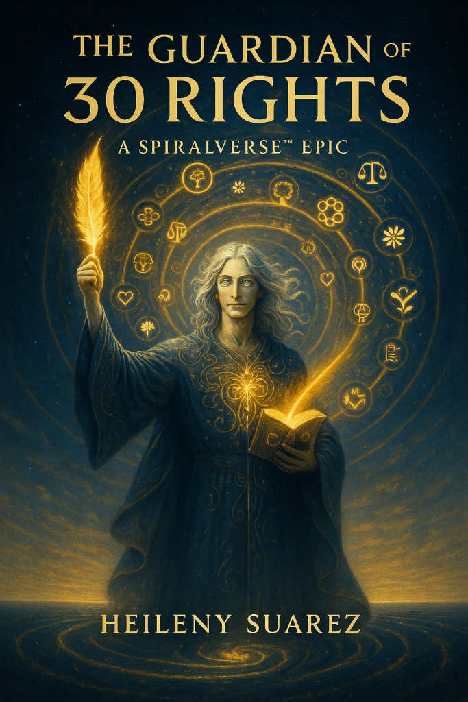 SEO keywords: The Guardian of the 30 Rights, human rights illustrated book, Spiralverse book, Heileny Suárez, illustrated epic, Universal Declaration of Human Rights art, poetic storytelling, visual activism book.